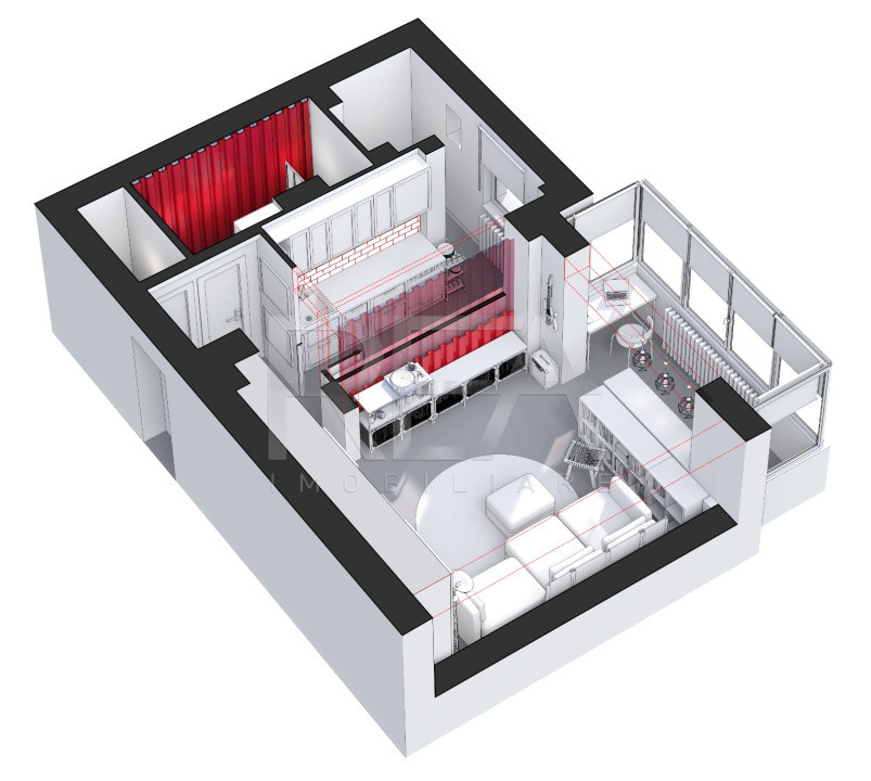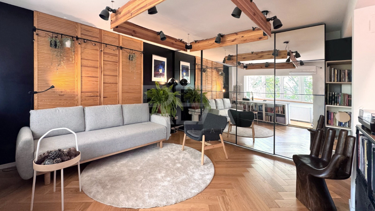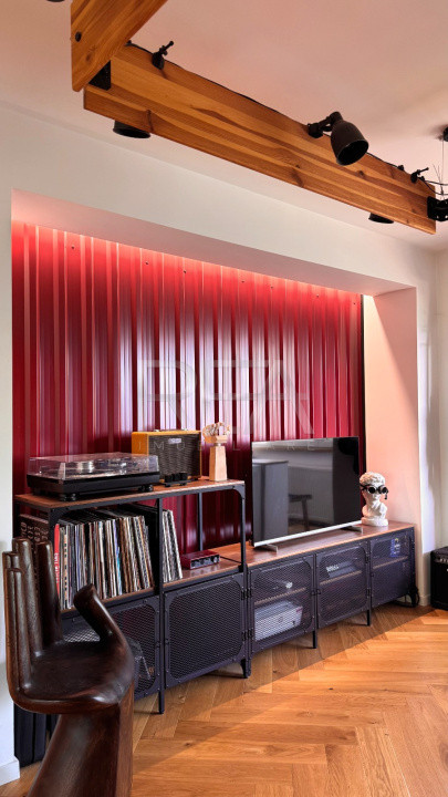 - Living: canapea extensibilă, fotoliu, dulap cu uși oglindă (spațiu pentru saltea suplimentară), comodă TV, bibliotecă, birou și corp de iluminat custom;