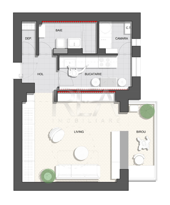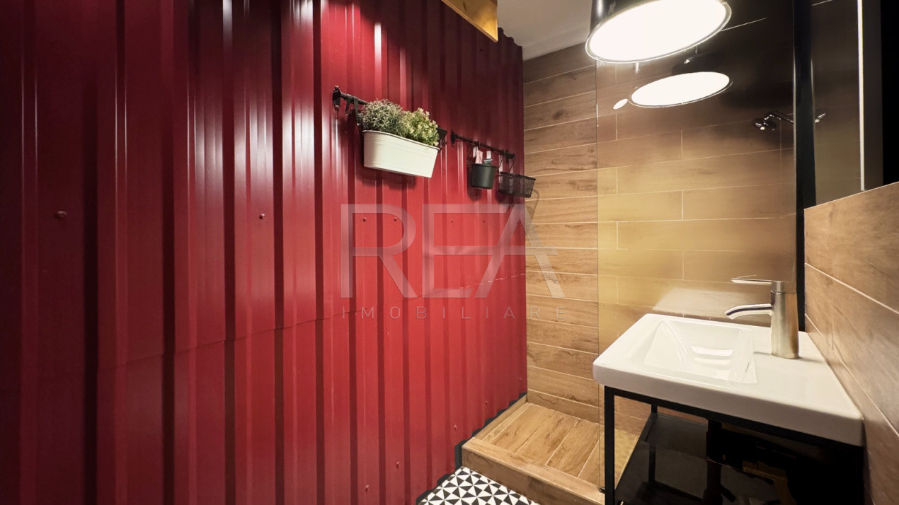 - Cămară: spațiu tehnic cu centrală termică proprie, frigider și mașină de spălat rufe;