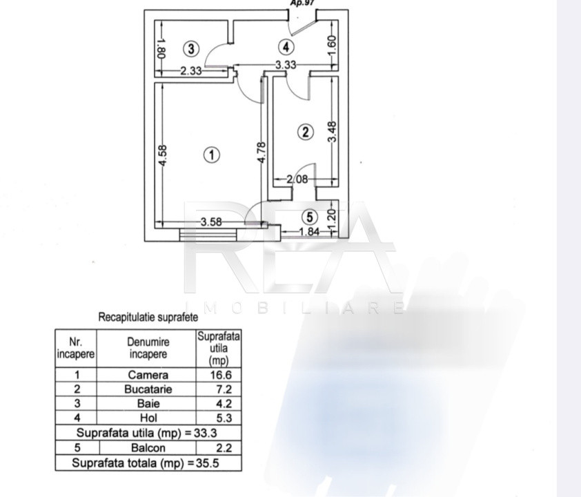 Suprafață totală: 35,5 mp, utilă 33,3 mp, balcon 2,2 mp.