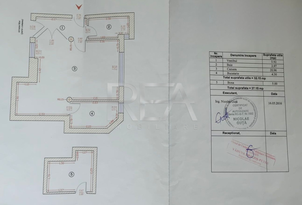 Suprafata totala de 37,15m.p, din care suprafata utila 32,15 m.p + boxa 5 m.p.