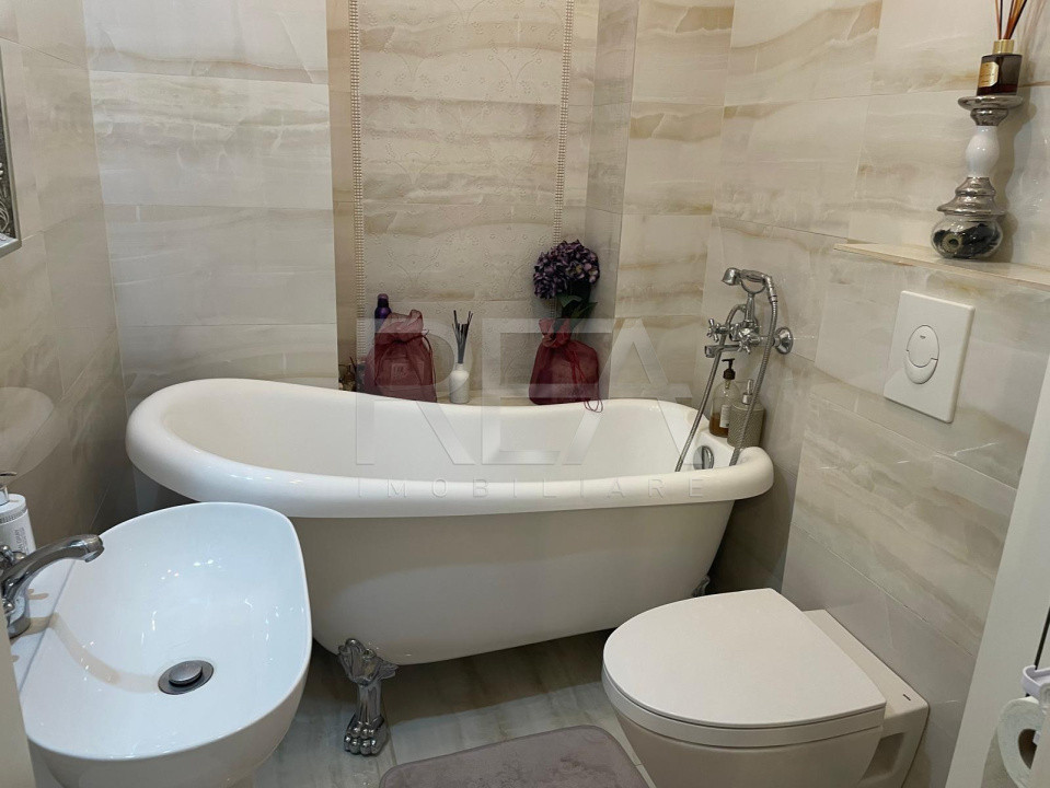 Baia, finisată cu materiale de înaltă calitate, dispune atât de cadă, cât și de duș walk-in, oferind un spațiu de relaxare sofisticat și practic.