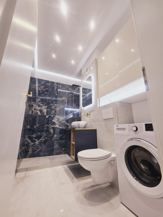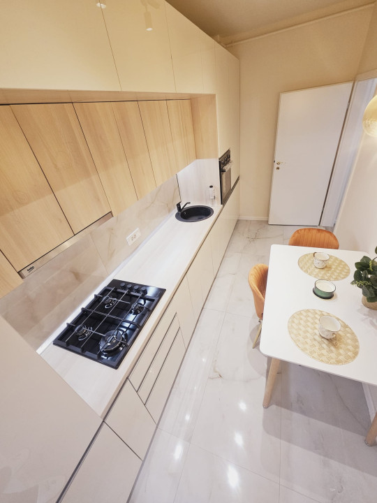 • Finisaje de calitate: pardoseală din gresie cu aspect marmorat în bucătărie și hol, parchet laminat în living, mobilier minimalist și electrocasnice integrate;