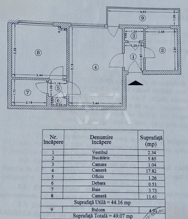 - Suprafață totală 49,07 mp: 44,16 mp utili + 4,91 mp balcon.
