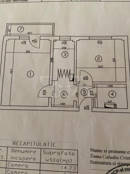Detine o suprafata totala de 38,57mp din care utili 35,73mp iar restul de 2,84mp fiind alocati unui balcon.
