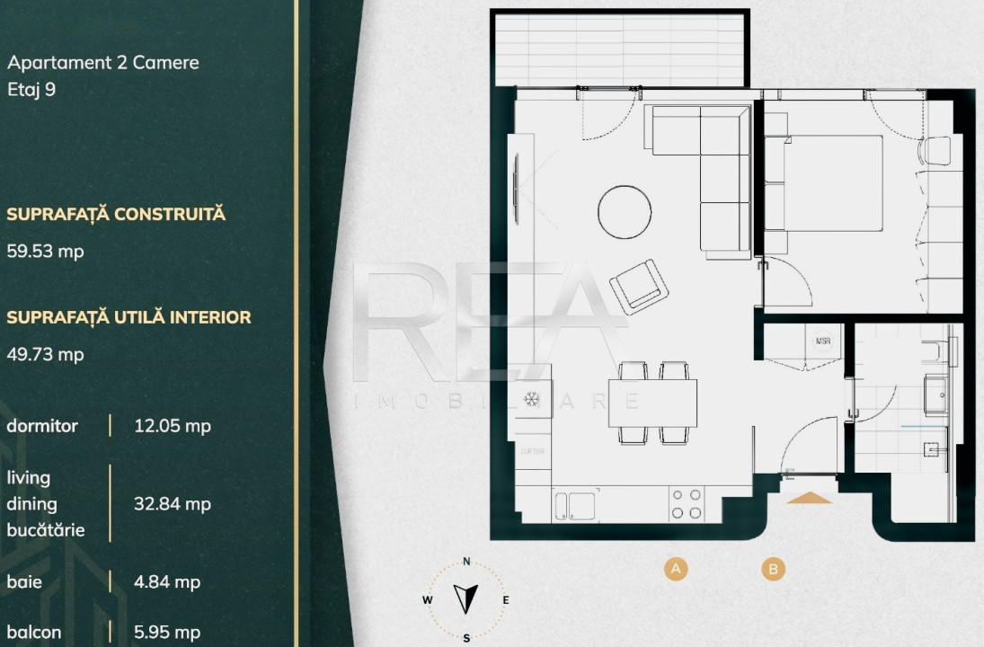 - Suprafață totală de 55,68 mp: 49,73 mp utili+ 5,95 mp balcon.