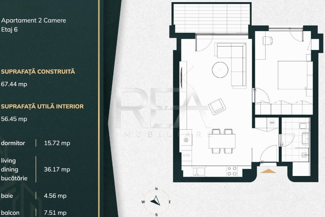 – Suprafață totală de 63,96 mp: 56,45 mp utili+ 7,51 mp balcon.