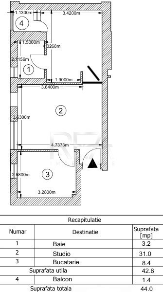 - Suprafață totală de 44 mp: 42,6 mp utili+ 1,4 mp balcon.
