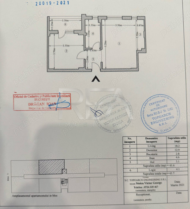 Detine o suprafata totala de 45,7mp din care utili 41,6mp restul de 4,1mp fiind alocati unei logii.
