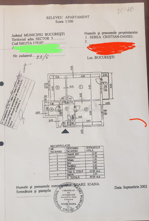 Detine o suprafata totala de 49,09mp din care utili 45,84mp restul de 3,25mp fiind alocati unui balcon.