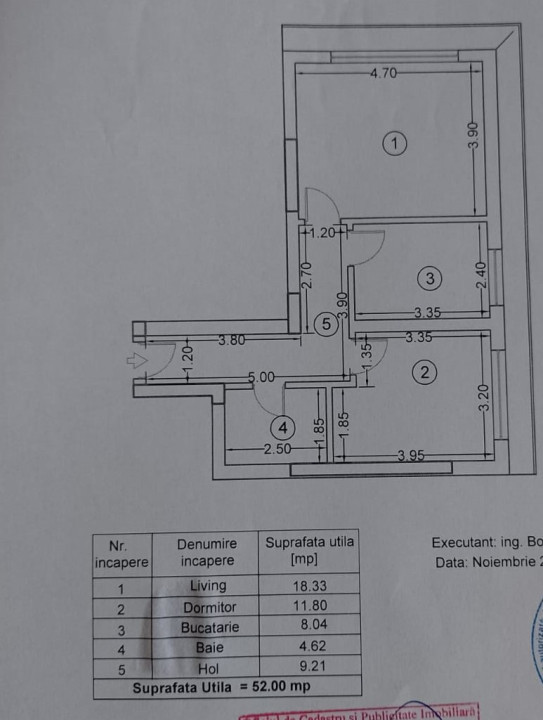 Imobilul se afla intr-un bloc de apartamente, construit in anul 2018, la etajul 4/5, detine o suprafata utila totala de 52 m.p.