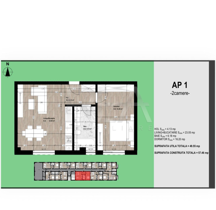 Apartamentul este compus dintr-un living spațios și luminos, dormitor confortabil, bucătărie deschisă și baie modernă, toate finisate cu materiale de calitate superioară. Dispunerea eficientă a spațiului asigură confort și funcționalitate, iar ferestrele mari oferă lumină naturală pe tot parcursul zilei.