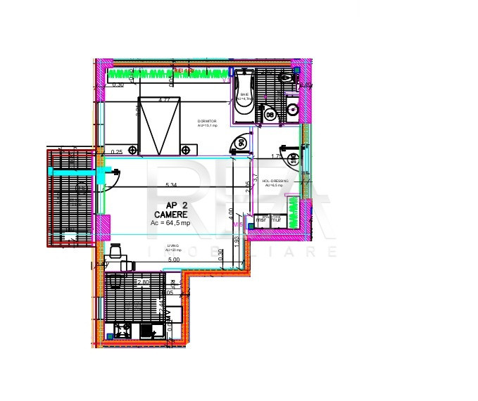 Imobilul se afla intr-un bloc de apartamente, construit in anul 2025, la etajul 2/10 si detine o suprafata totala de 59,5 m.p, din care suprafata utila este 54 m.p. si balcon in suprafata de 5.5 m.p.