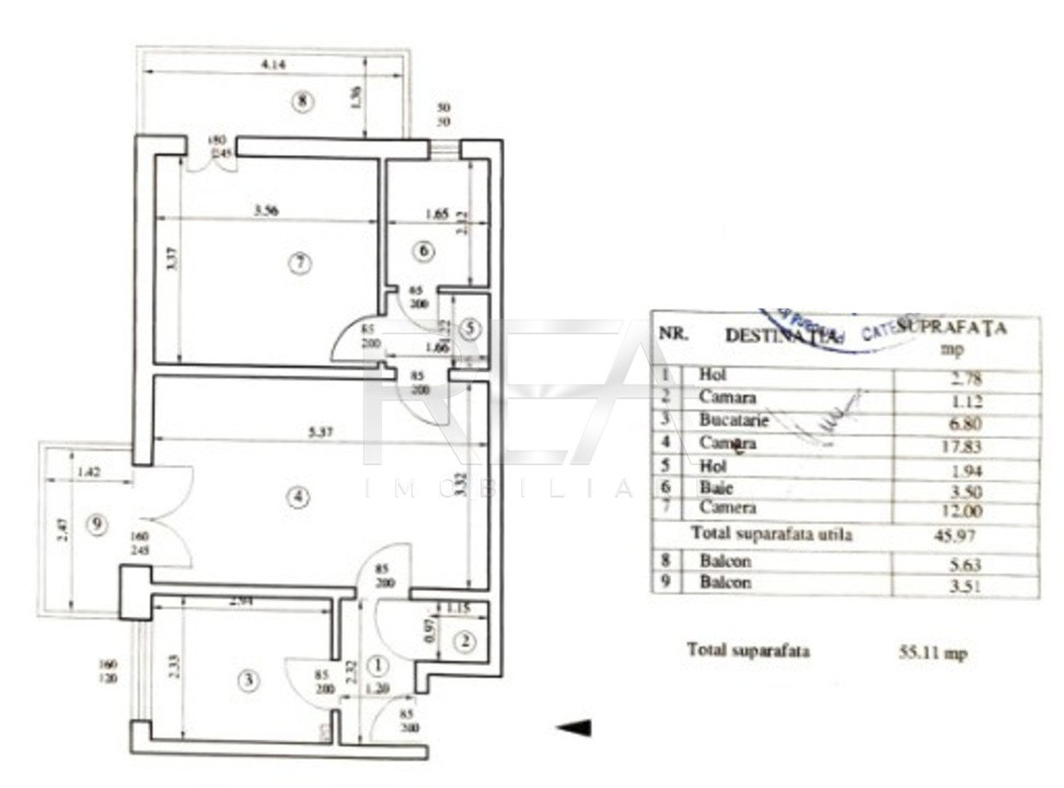 Apartamentul se află la etajul 3 al unui bloc cu 4 etaje și are o suprafață utilă de 55 mp, din care 9 mp sunt reprezentați de cele două balcoane.