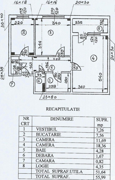 Suprafață totală de 55 m.p, din care suprafața utilă 51 m.p, balcon 4 m.p.