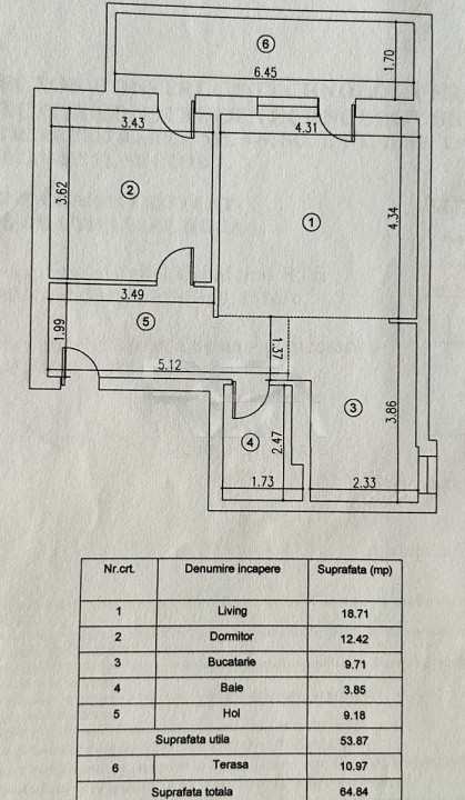 – Suprafață totală 64,84 mp: 53,87 mp utili+ 10,97 mp terasa
