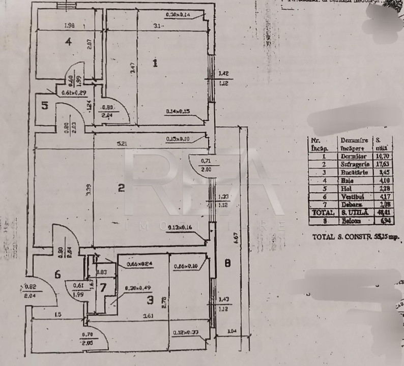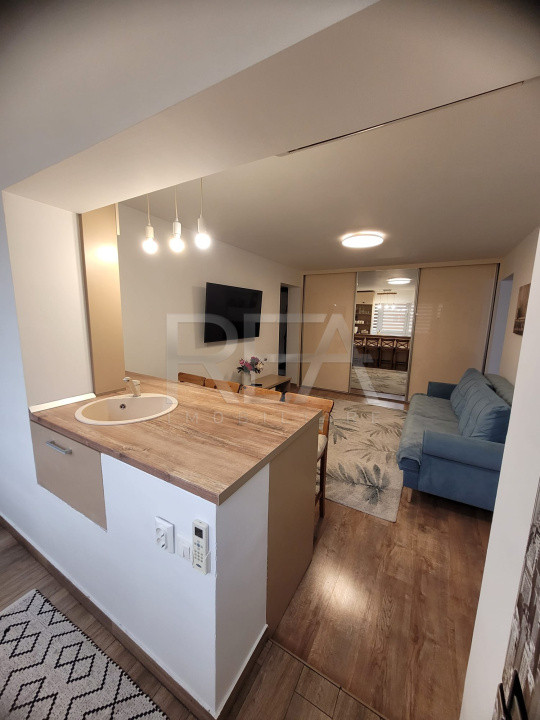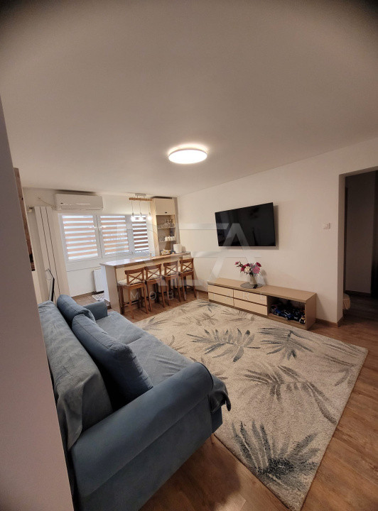 Apartamentul este alcatuit din living, dormitor, bucatarie, baie si balcon. Suprafata totala este de 57 mp, din care suprafata utila este de 56 mp. Apartamentul a fost renovat complet, instalatiile electrice/sanitare au fost schimbate. Este instalat si boiler.