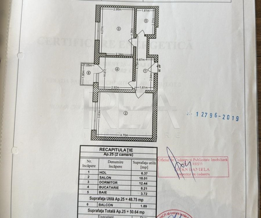 Imobilul se afla intr-un bloc de apartamente, construit in anul 2019, la etajul 4/9 si detine o suprafata totala de 50.64 m.p, din care suprafata utila este 48,75 m.p. si balcon in suprafata de 1.89 m.p.