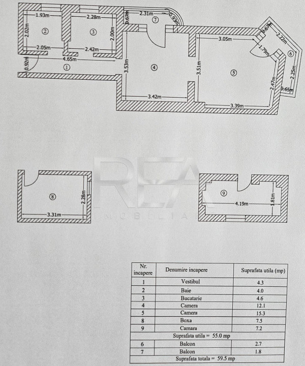 Se află la etajul 1 al unui imobil tip vilă cu un etaj și are o suprafață utilă totală de 59 mp, din care 4 mp sunt reprezentați de cele două balcoane.