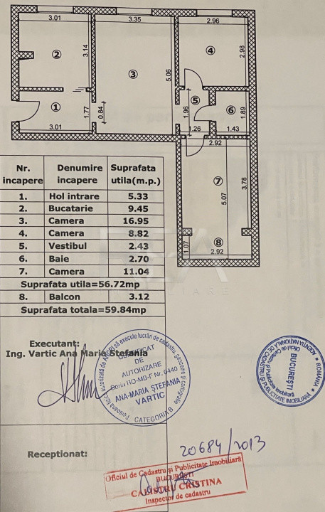 Apartamentul are o suprafață totală de 59,84 mp și sunt împărțiți în felul următor: