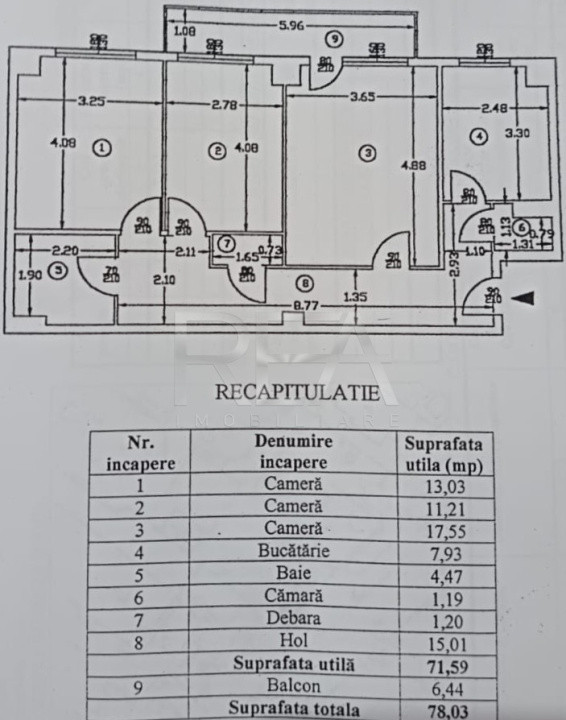 - Suprafață totală 78,03 mp: 71,59 mp utili+ 6,44 mp balcon.