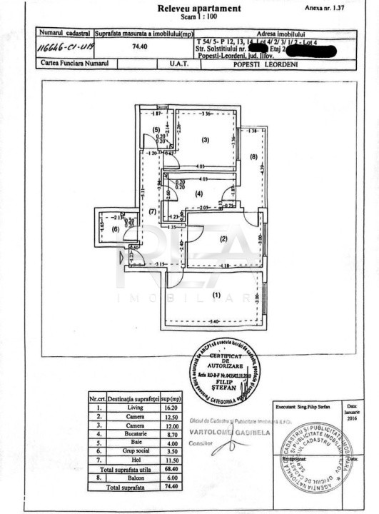 Detine o suprafata totala de 74,4mp din care utili 68,4mp si un balcon de 6mp.