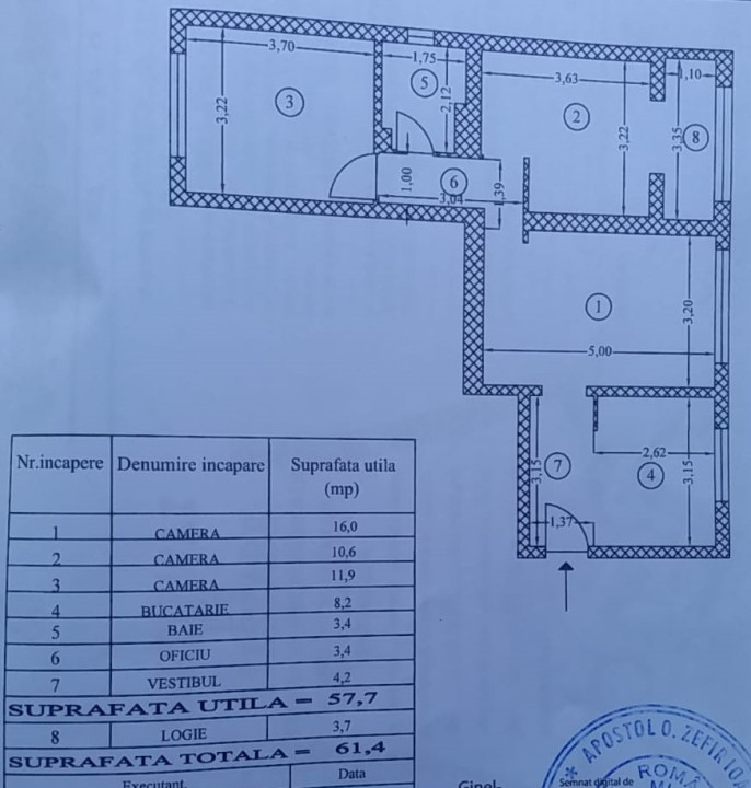 Imobilul se afla intr-un bloc de apartamente, construit in anul 1961, la etajul 1/4, cu o suprafata totala de 61.4 m.p, din care suprafata utila este de 57,7 mp, iar balconul 3,7 m.p.