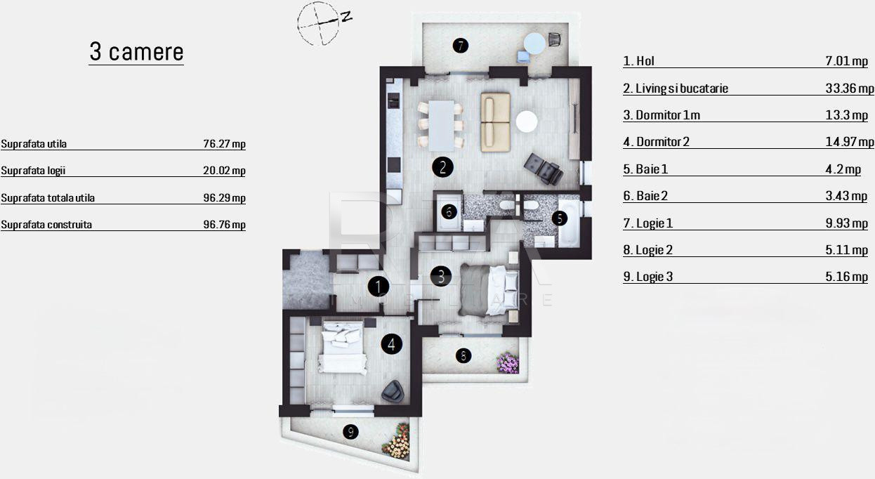 Suprafata totala 96,29 mp, suprafata utila 76,27 mp, balcoane 20,02 mp - balcon 9,93 mp, balcon 5,11 mp, balcon 5,16 mp.