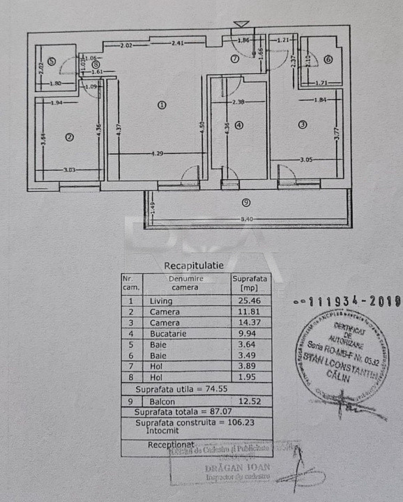 Suprafata totala de 87,07 m.p, din care suprafata utila 74,55 m.p, balcon 12,52 m.p.