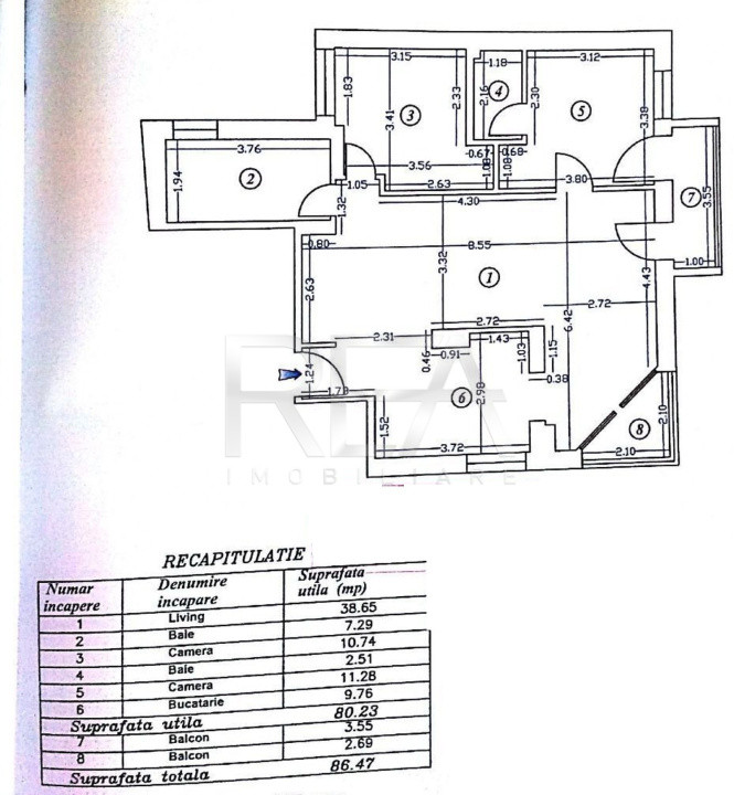 Compartimentare: living, două dormitoare, bucătărie, două băi și două balcoane.