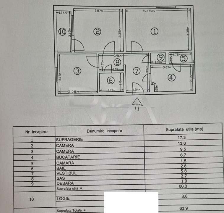 Compartimentare: living, două dormitoare, bucătărie, baie și balcon.