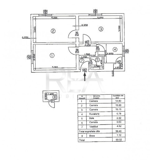 Compartimentare: living, două dormitoare, bucătărie și baie. Bucătăria este mobilată și utilată. De renovat parțial.