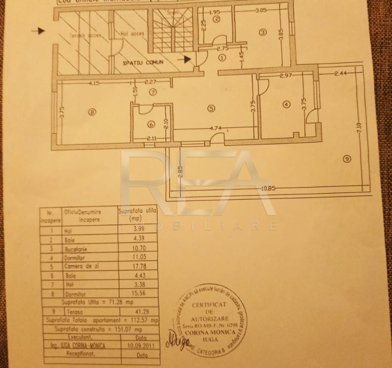 Suprafata totala de 112,57 mp, suprafata utila 71,28 mp, terasa 41,29 mp. Ambient placut, liniștit.