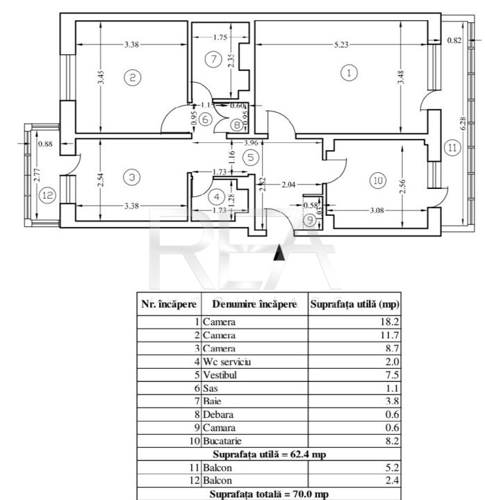 Se află la etajul 2 al unui bloc cu 4 etaje și are o suprafață utilă totală de 70 mp, din care 8 mp sunt reprezentați de cele doua balcoane.