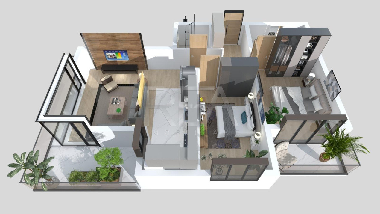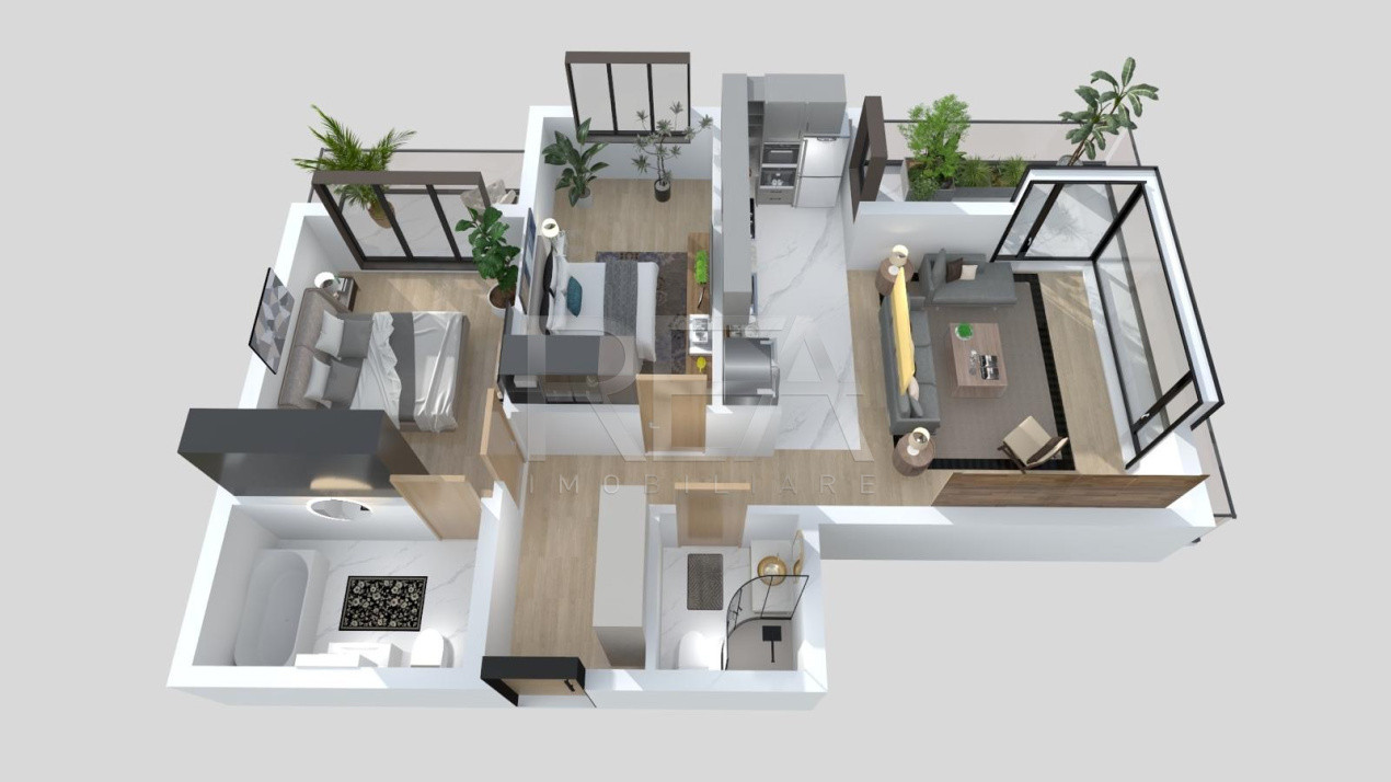 - Configurație: 2 dormitoare, living, bucătărie, hol, 2 bai si 2 balcoane.