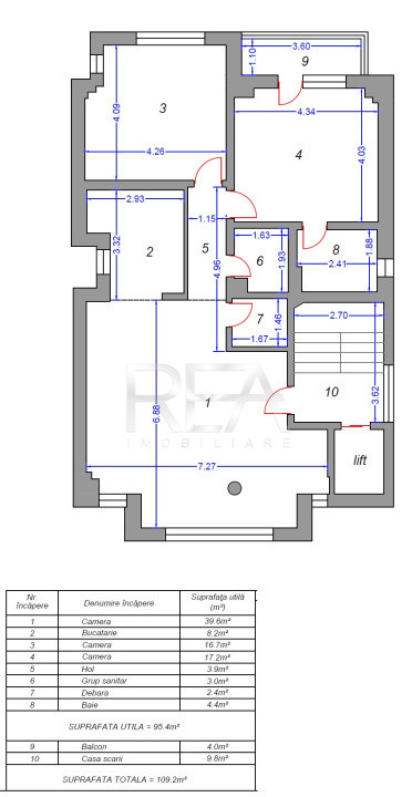 Se află la etajul 2 al unui bloc cu 3 etaje și are o suprafață utilă totală de 99 mp, din care 4 mp sunt reprezentați de balcon.