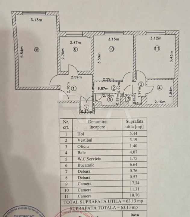 Detine o suprafata totala de 67mp din care utili 63,13mp restul de 3,87mp fiind alocati unui balcon.