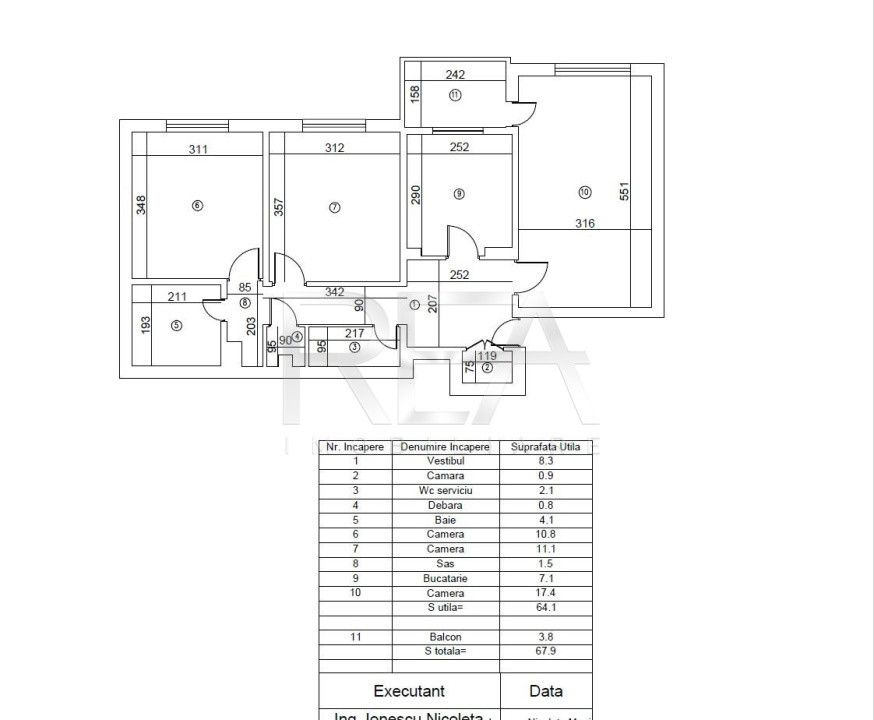- Compartimentare: living, 2 dormitoare, bucătărie închisă, 2 bai, balcon, hol, spatii de depozitare.
