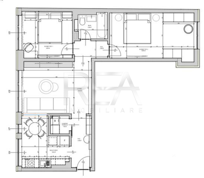 Compartimentare: living, două dormitoare, bucătărie, baie și balcon.