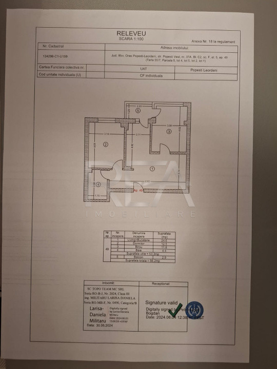 Suprafata totala de 53,3 m.p, din care suprafata utila 56,2 m.p, balcon 2,9 m.p.
