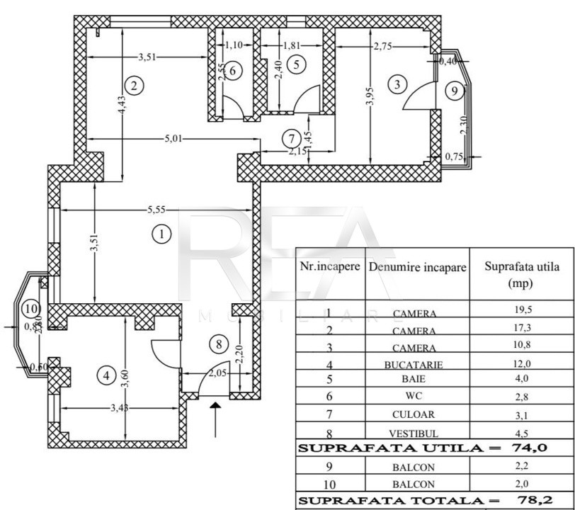 Se află la etajul 3 al unui bloc cu 4 etaje și are o suprafață utilă totală de 78 mp, din care 4 mp sunt reprezentați de cele două balcoane.