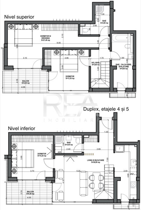 Nivel inferior: dormitor, living, bucatarie, hol, baie, scara si balcon;