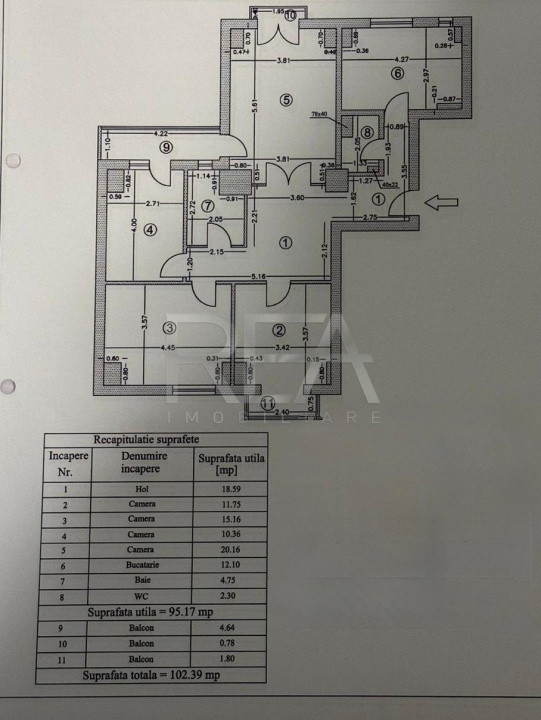 • Suprafață totală: 102,39 mp, utilă: 95,17 mp, balcoane: 7,22 mp