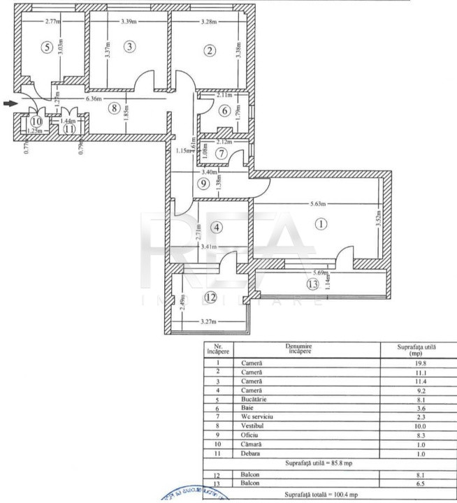Se află la etajul 7 al unui bloc cu 10 etaje și are o suprafață utilă totală de 100 mp, din care 14 mp sunt reprezentați de cele două balcoane.