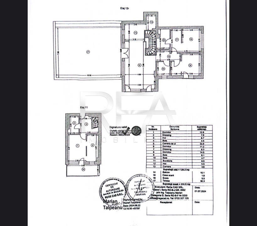et.12 - camera de zi - 33.90mp, dormitor - 11,20mp, dressing, al doilea dormitor -14,50mp, doua bai (6,10mp si 4,70mp), bucatarie, hol, camara + TERASA 90,30mp. TOTAL SUPRAFATA UTILA - 126,20mp, TOTAL SUPRAFATA - 233,90mp.