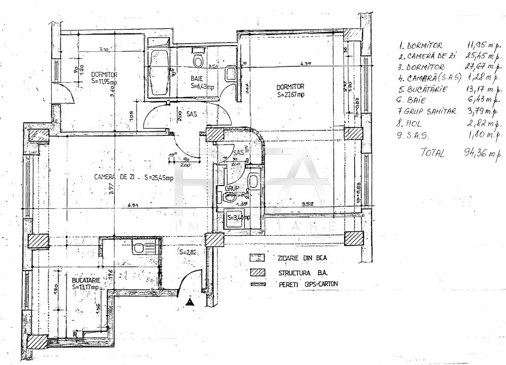 Compartimentare: living, trei dormitoare, bucătărie, două băi și două balcoane.