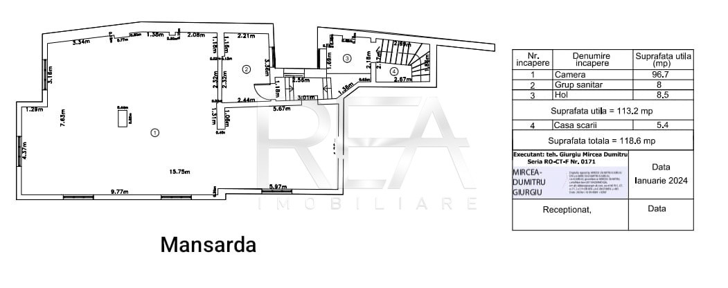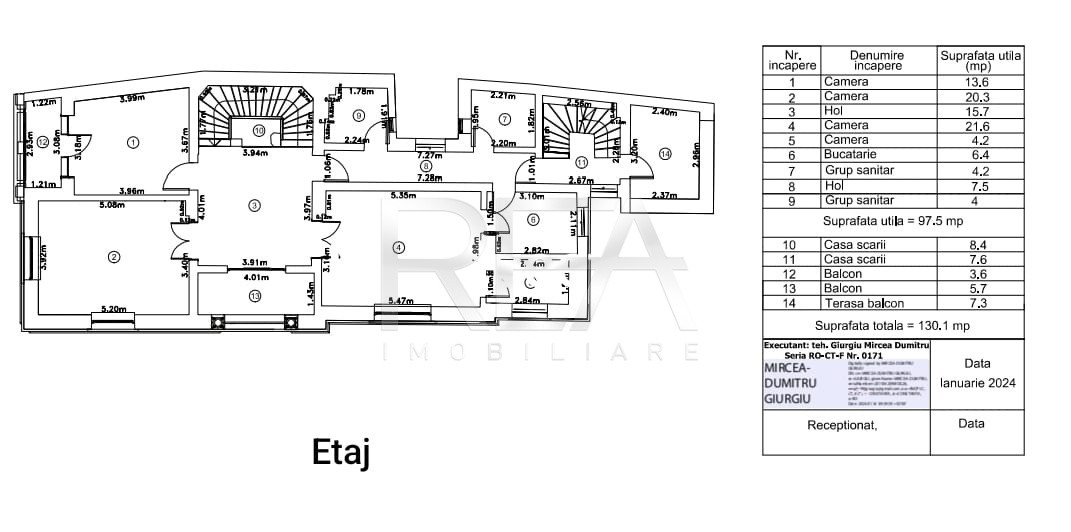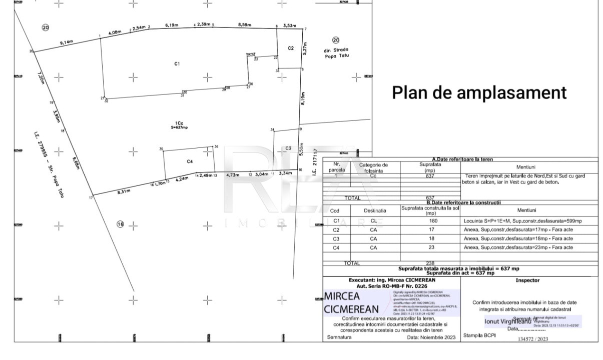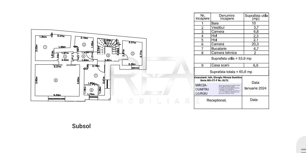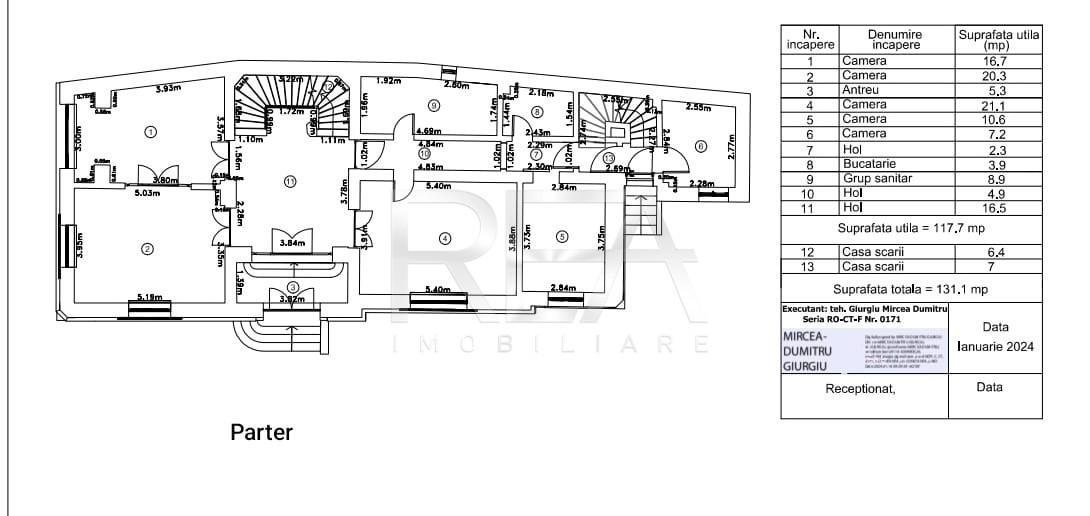 Casa de birouri de inchiriare cu 11 camere, cu 2 etaje plus mansarda, finalizat 1937. Suprafata totala de 382 mp, din care suprafata utila 374,9 mp, balcaone 7,3 mp iar curtea are o suprafata totala de 637 mp din care suprafata utila 457 mp. Configuratie: 11 camere, 3 bucatarii, 5 bai, 3 balcoane, spatiu de depozitare si un foisor. Sistem de incalzire: centrala proprie.