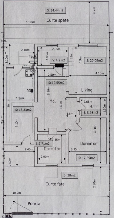 Suprafață utila de 91,11 m.p, curte spate 54,44 mp, curte fata 28 mp si deschidere 10 mp.